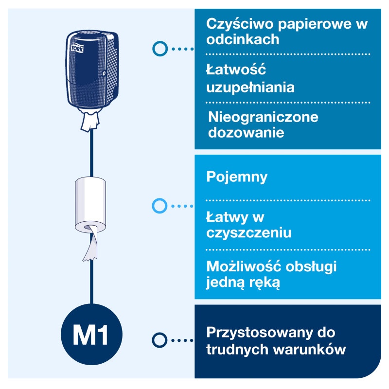 Dozownik może być wykorzystywany z ręcznikami Tork w systemie M1, których wykorzystywanie pozwoli znacząco zmniejszyć zużycie wkładów.